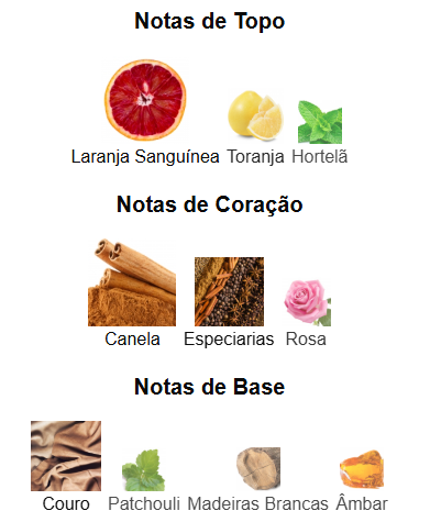 Fundo: Couro Aveludado, Madeira Branca, Âmbar e Patchouli da Indonésia.