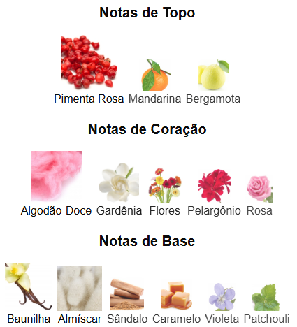 A Pimenta-Rosa predomina, seduzindo sem agredir. A Baunilha e o Almíscar dão o tom doce. Um bouquet de flores e frutas levemente cítricas, que tornam este perfume delicado e muito sofisticado.
