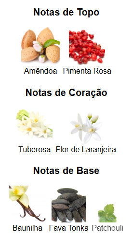 Por fim, o fundo quente e envolvente de Fava Tonka, Baunilha e Patchouli confere um aroma doce e amadeirado que perdura na pele, transmitindo uma sensação de conforto e sensualidade.