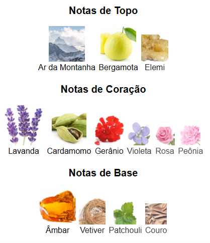 Corpo: Cardamomo, Lavanda, Gerânio, Violeta, Rosa e Peônia.