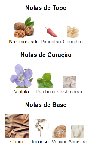 Sua jornada olfativa começa com a combinação envolvente da noz-moscada quente e picante, complementada pelo toque ardente do gengibre. O pimentão, ou pimenta da Jamaica, adiciona um leve dulçor e profundidade, criando uma sensação de intriga que prepara o caminho para o desenvolvimento do perfume.