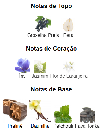 Fundo: Patchouli, Fava Tonka, Baunilha e Pralinê.