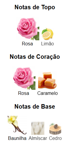 Notas Olfativas: - Topo: Notas florais delicadas que trazem frescor e leveza. - Coração: Um buquê floral suave e envolvente que destaca a feminilidade e a doçura. - Base: A baunilha intensa que aquece e prolonga o aroma na pele, proporcionando conforto e charme durante todo o dia.