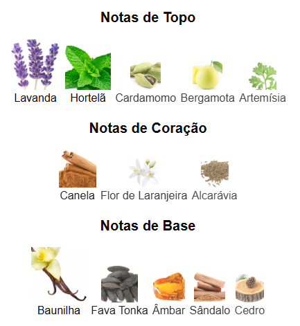 Fundo: Sândalo, Baunilha, Cedro, Fava Tonka e Âmbar.