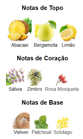 A fragrância abre com um revigorante acorde de bergamota da Calábria e abacaxi. No coração, o calor solar e o vício são contrastados por notas aromáticas de gerânio e sálvia. Sussurros de vetiver terroso e facetas amadeiradas do envelope de patchouli, conferindo à fragrância um rastro poderoso e sofisticado.