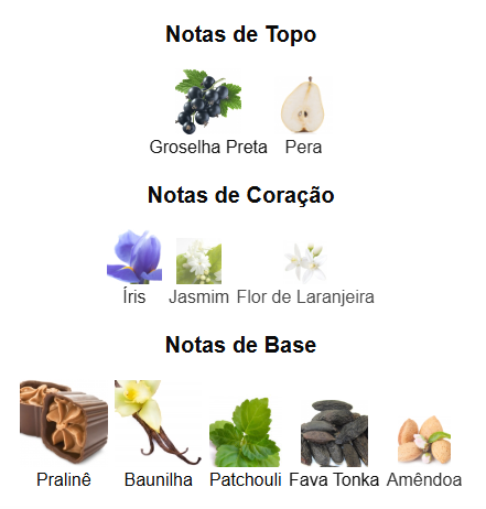 Fundo: Feijão de Tonka, Amêndoa, Patchouli, Praliné e Baunilha.