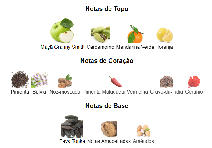 Uma nota de topo fresca onde o Limão elétrico se combina com a frescura do Complexo de Especiarias Negras (Pimenta Preta, Malagueta Preta, Noz-moscada e Cravinho).